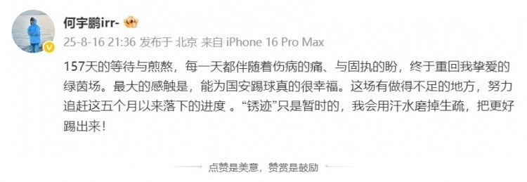 何宇鹏在微博中深情写道:"157个日夜的坚守与期盼,每一天都在伤痛与渴望中度过。如今终于重返这片我深爱的球场。最深的体会就是,能身披国安战袍是莫大的幸福。虽然表现还有提升空间,但我会全力追赶这五个月落下的训练。暂时的生疏终将被汗水冲刷,更好的表现一定会到来!"